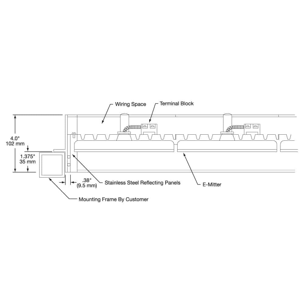 Design Features Size: 95 mm x 295 mm (3.72″ x 11.61″) Universal mount designed to be dropped into existing systems regardless of manufacturer. Optional color changing material to indicate if E-mitter is on or off. Standard stocked voltage: 120 or 220/240V as noted; other voltages are available. Long operating life—over 10,000-plus hours of continuous operation under normal conditions Performance is unaffected by vibration or adverse atmospheric conditions. 2.5 to 6µm infrared radiation wavelength