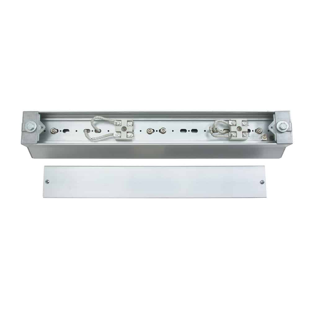 Design Features Designed for use with CRB, CRC, CRN or CRZ E-Mitters Lightweight extruded aluminum housing with 5/16-18 mounting bolts for use up to 250°C (482°F) extrusion temperature E-Mitters are easily replaced by removing the top cover Internal mounting hole pattern simplifies mixing and matching E-mitter sizes and ratings Space between reflector and housing can be used with any manufactruer’s standard 60 x 245 mm or 60 x 122 mm heaters Wiring entrance 7.8″ diameter at both ends, for 1/2″ trade size electrical fittings