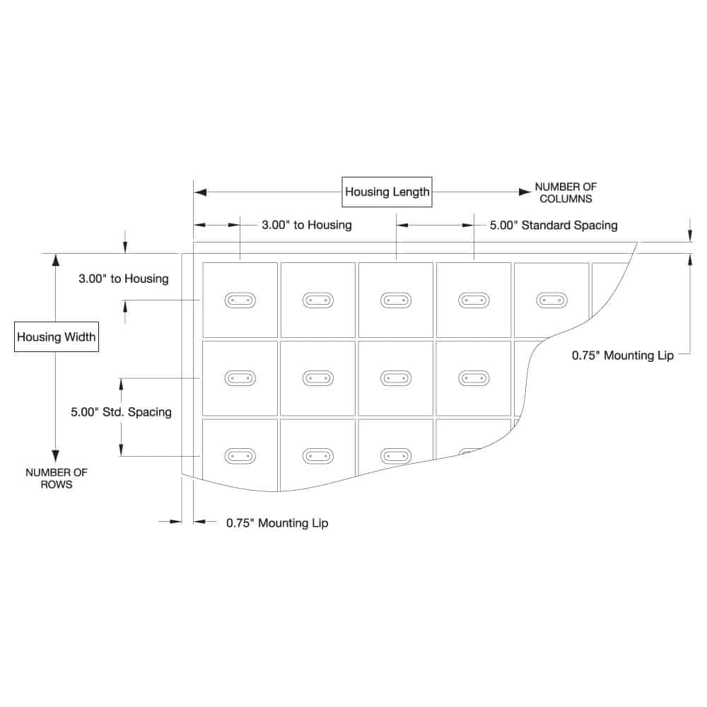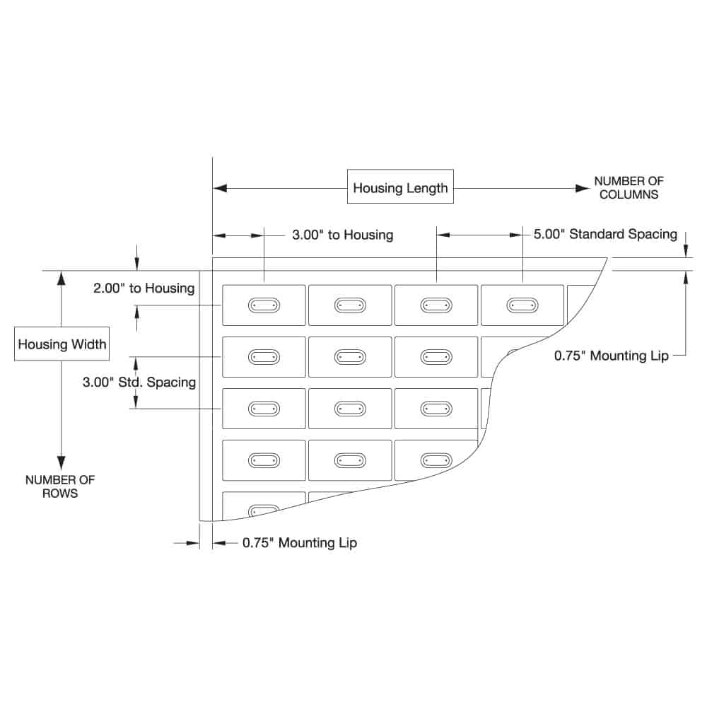 A) The Number of Rows will determine the Housing Width. For overall width add 1.50″ (for the mounting lips). B) The Number of Columns will determine the Housing Length. For overall length add 1.50″ (for the mounting lips).
