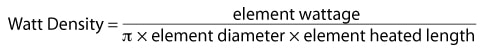 The recommended watt density is based on a maximum element sheath temperature of 1400°F (760°C). Air and other gases that are poor conductors of heat require watt densities matched to the velocity of the gas flow to prevent element overheating. Selecting a lower watt density for the heating elements will extend heater life expectancy.