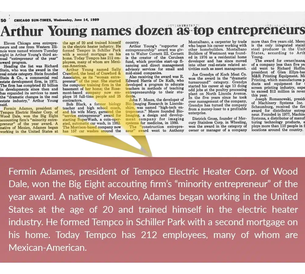 Tempco was founded to manufacture electric heating elements for a wide range of industrial, commercial, scientific and medical applications. Mr. Adames’ leadership, ingenuity, dedication to hard work and focus on high-quality products and service have led Tempco to become one of the best electric heating element manufacturers in the world.