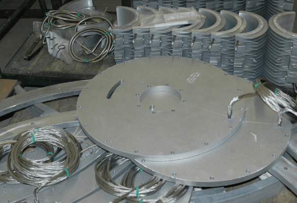 An automotive client used specialized cast-in heaters to assemble brake rotors. Platens were positioned at the top and bottom of two halves of the rotor components to compress and fuse them together. (Surrounding parts used to encapsulate the rotor shims were also treated with Tempco cartridge heaters.) “The platens are a good fit not only for function, but durability”.