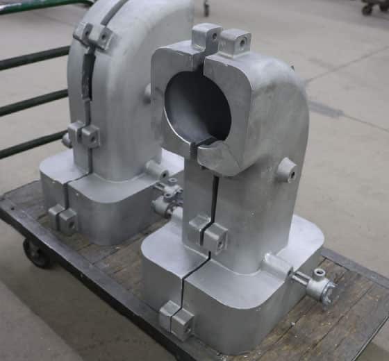 Custom cast-in heater unit with split-body design and base mounting system.