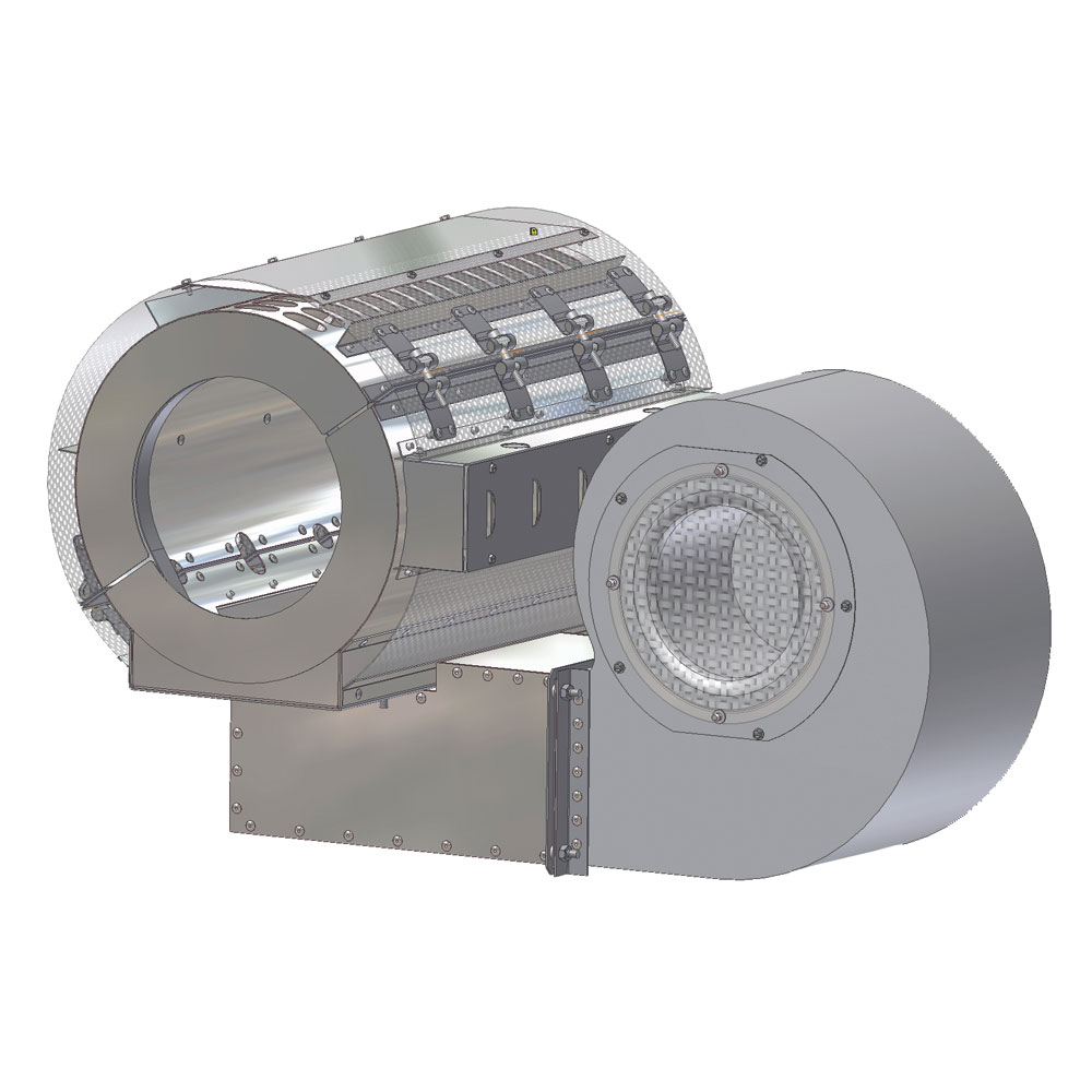 On blower mount half of shroud permits shroud to be opened for servicing without removing unit from barrel